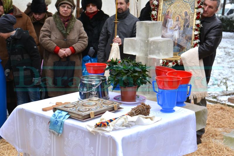 Cele aproximativ -10 grade Celsius au pătruns adânc în oasele celor prezenţi la Sf. Liturghie şi slujba de sfinţire a aghiasmei mari de miercuri, 6.01.2016, dar gândul la Botezul Domnului a păstrat sufletele calde credincioşilor dărăbăneni. Câţiva vrednici dărăbăneni au participat la construcţia crucilor de gheaţă, adevărate „opere de artă”. Meşterii au testat gheaţa Iazului Bălăşescu încă de luni, au făcut copci, să verifice dacă are grosimea proprie. „Când am intrat cu căruţa pe iaz şi după ce am tăiat blocurile de gheaţă, vedeam cum crapă gheaţa sub noi” ne-a mărturisit, Costel Negru, unul dintre „sculptorii” gheţii care a fost tăiată cu drujba de pe iaz şi urcată în căruţă sub formă de blocuri. Cel puţin crucea de la Biserica „Sf. Constantin şi Elena” a fost finisată în 7 ore.